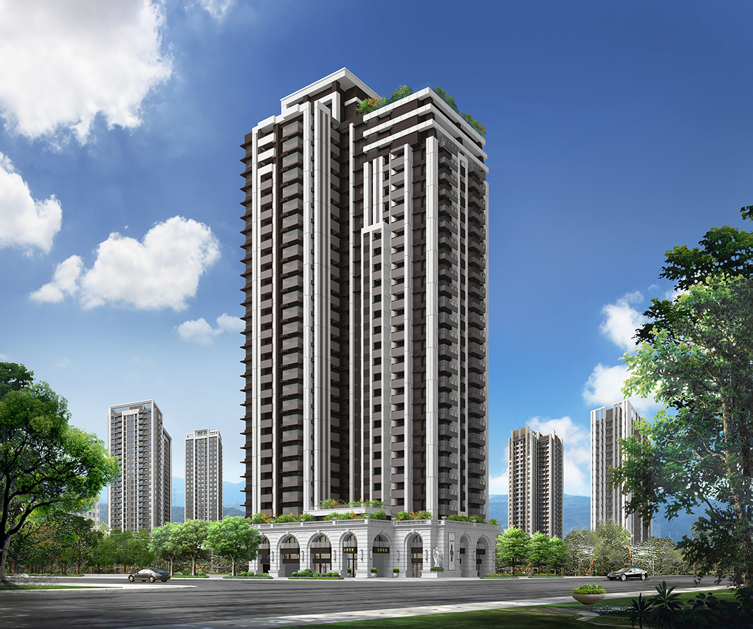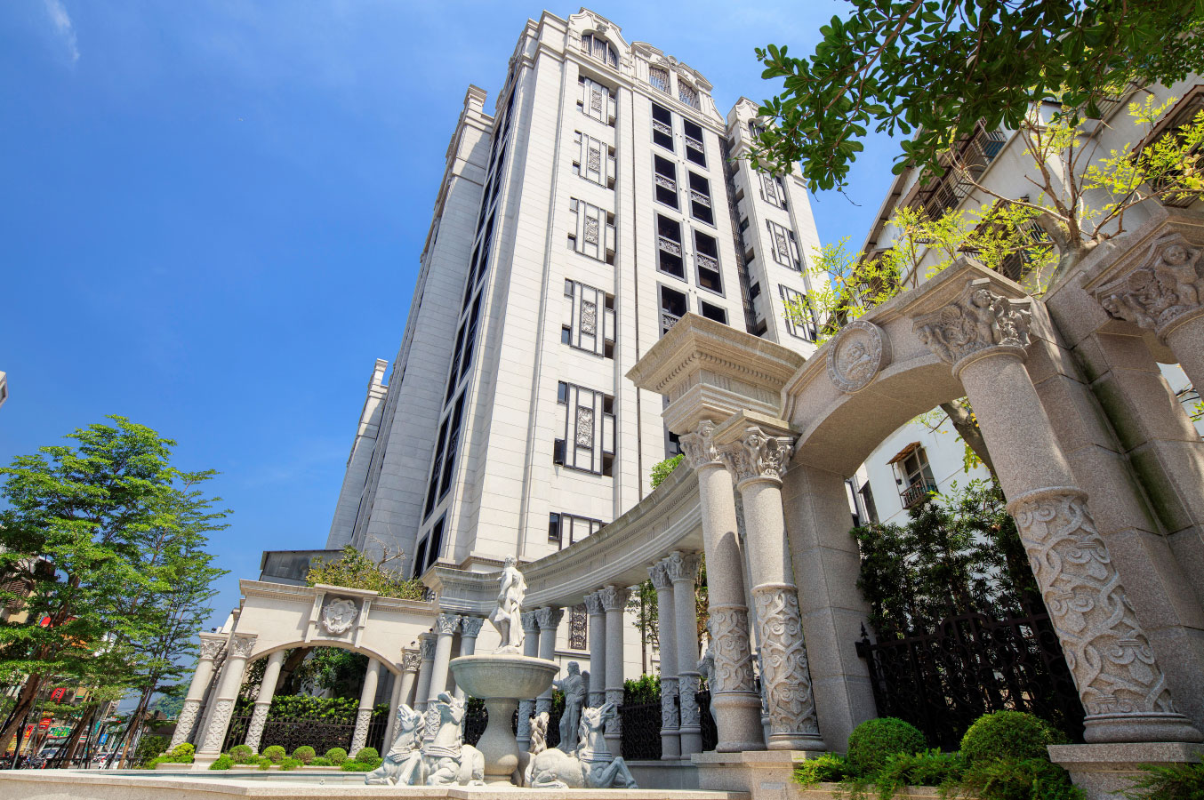 古典巴洛克崗石基座,媲美台灣第一豪宅-仁愛帝寶;一刀一鑿,弧線基座、拔高10米柱廊,展現連拱美學;法國邊石材、迎賓雕像,鄰里欽羨