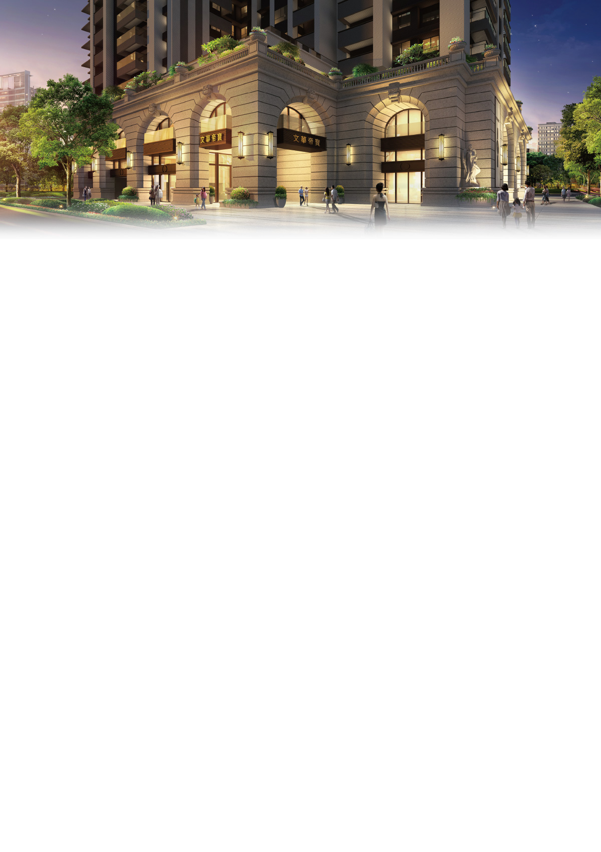 甲山林、宏國關係企業-宏道地產,雙強擘劃「文華帝寶」;一刀一鑿,弧線基座、拔高10米柱廊,展現連拱美學;法國邊石材、迎賓雕像,氣宇非凡