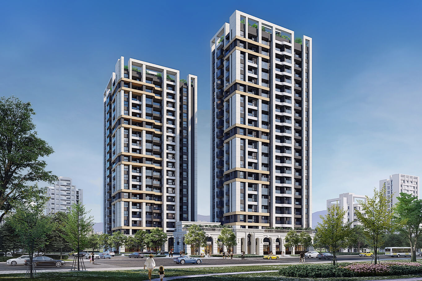 現代兼具古典的外觀設計,55米寬巴洛克崗石基座,退縮6米林蔭商店,基地採三面臨路規劃,戶戶大棟距。