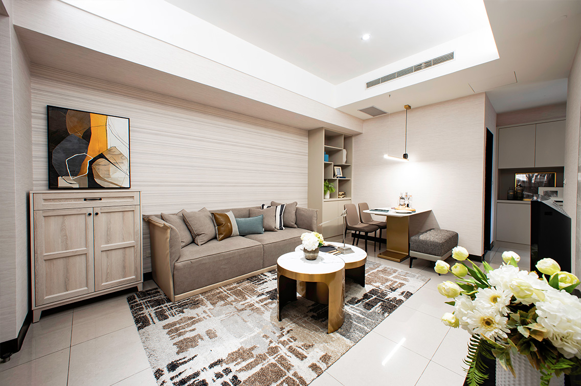 2房2廳具獨立衛浴和廚房、陽台的寬敞房型格局,包含客餐廳和流暢的生活機能與奢華穩重的空間配置,適合作為一家人共處和商務洽談的完美港灣。