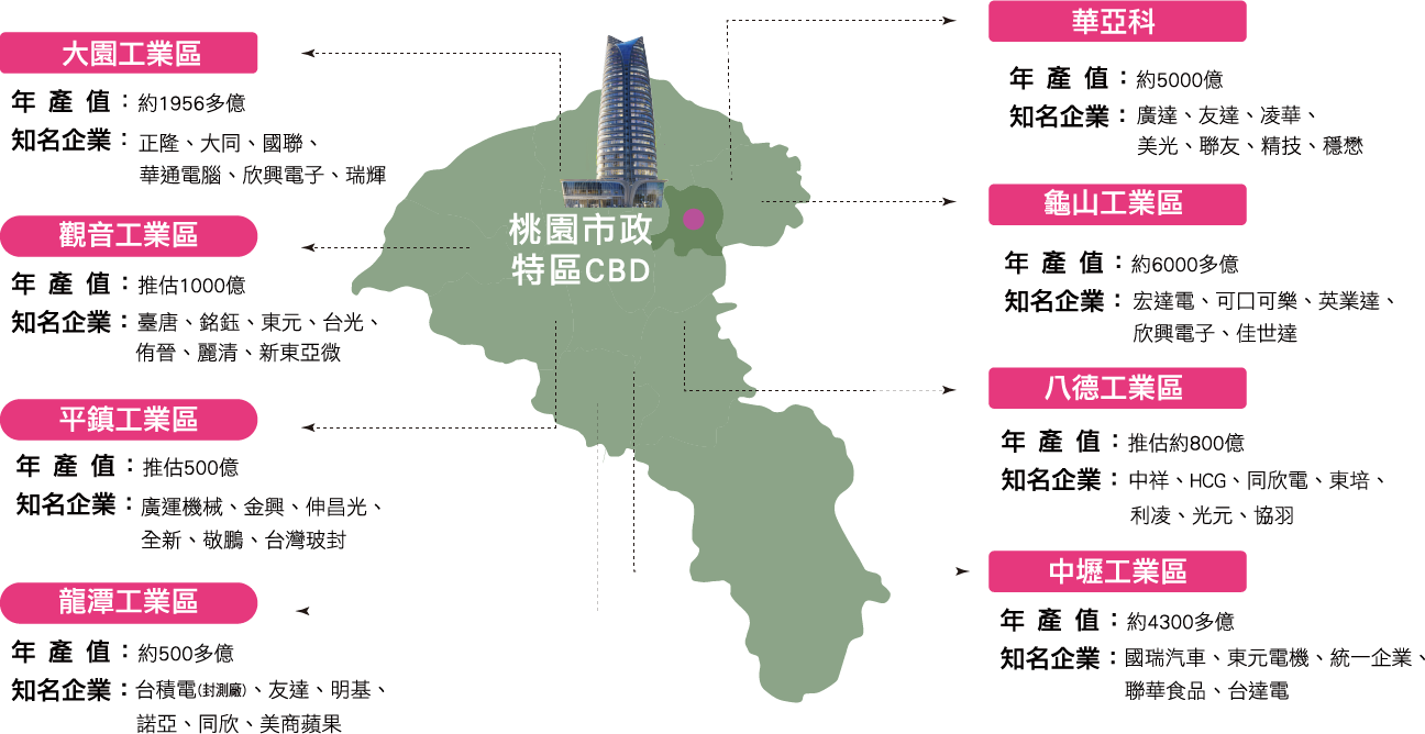 全台500大製造業,逾1/3設廠在桃園,產值約3兆元,居全台之冠,研發投資金約1100億元,產業群聚效益持續擴增