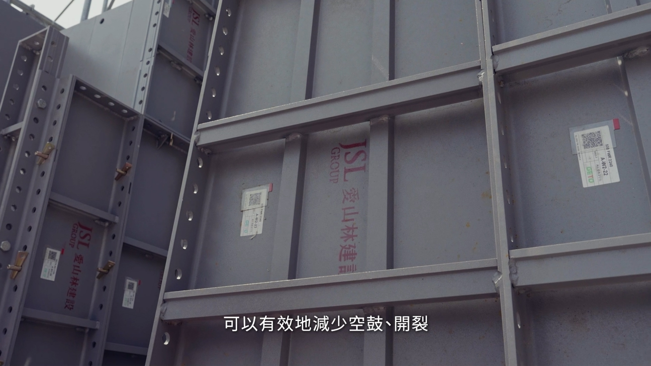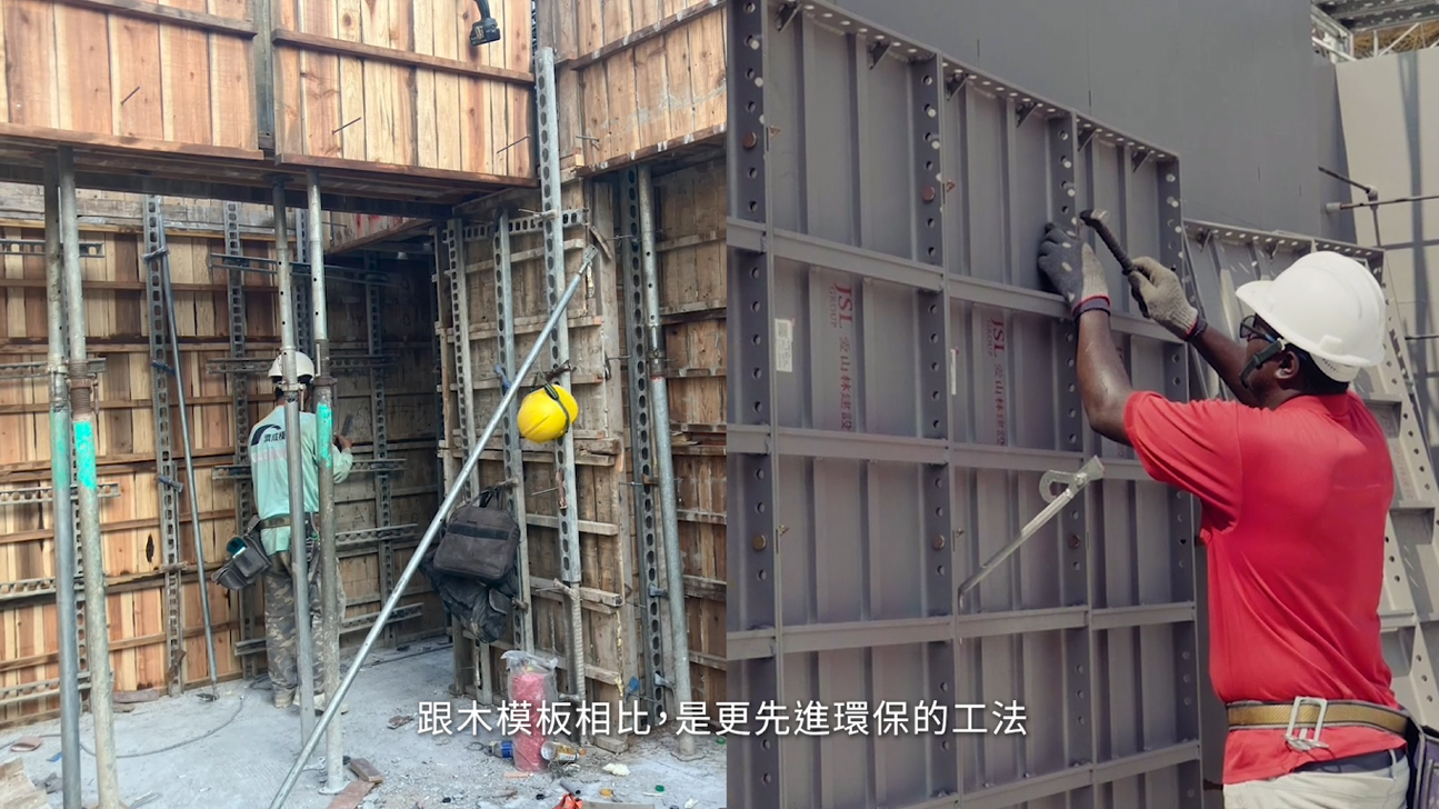 於混凝土澆置成型階段,採用高強度鋁合金模板取代木模板。鋁模一體成型精準度高,減少營建廢棄物,更能提升施工效率,符合新世代建築理念