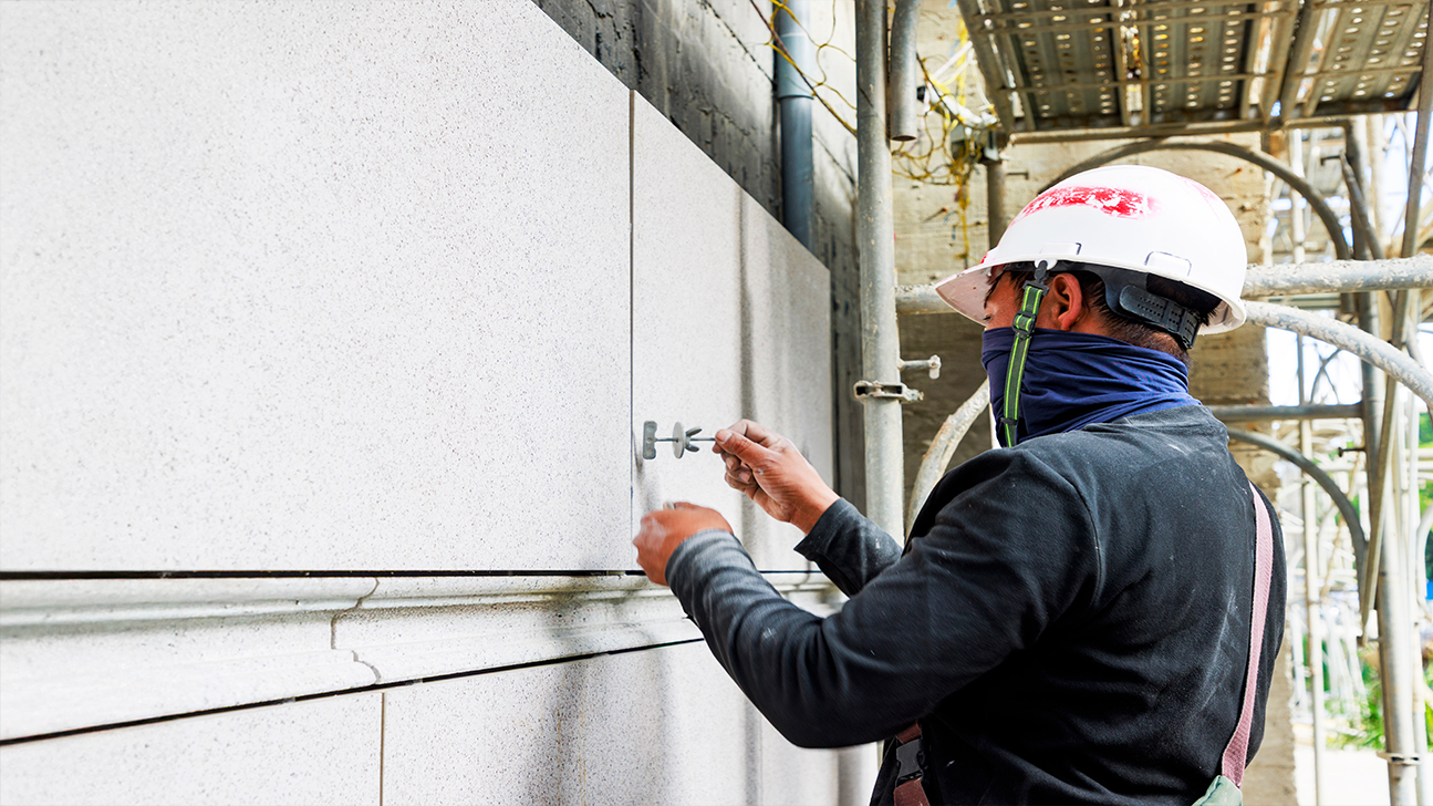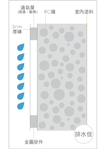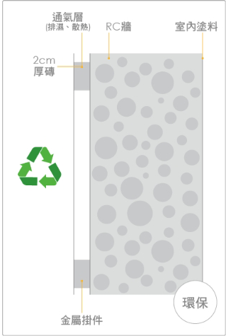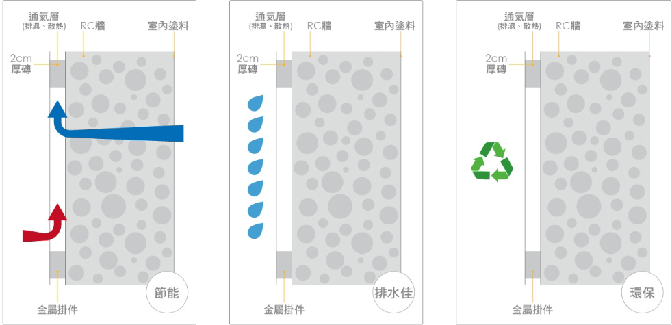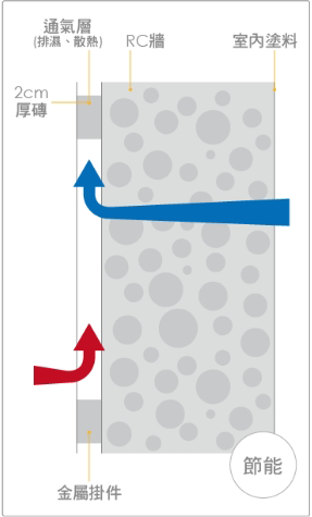 採用訂製金屬掛件,將2CM厚磚懸掛外牆,能導流牆體與室內空氣,降低室內溫度,本工法通過國震中心六強地震檢測,穩固耐久不脫落。