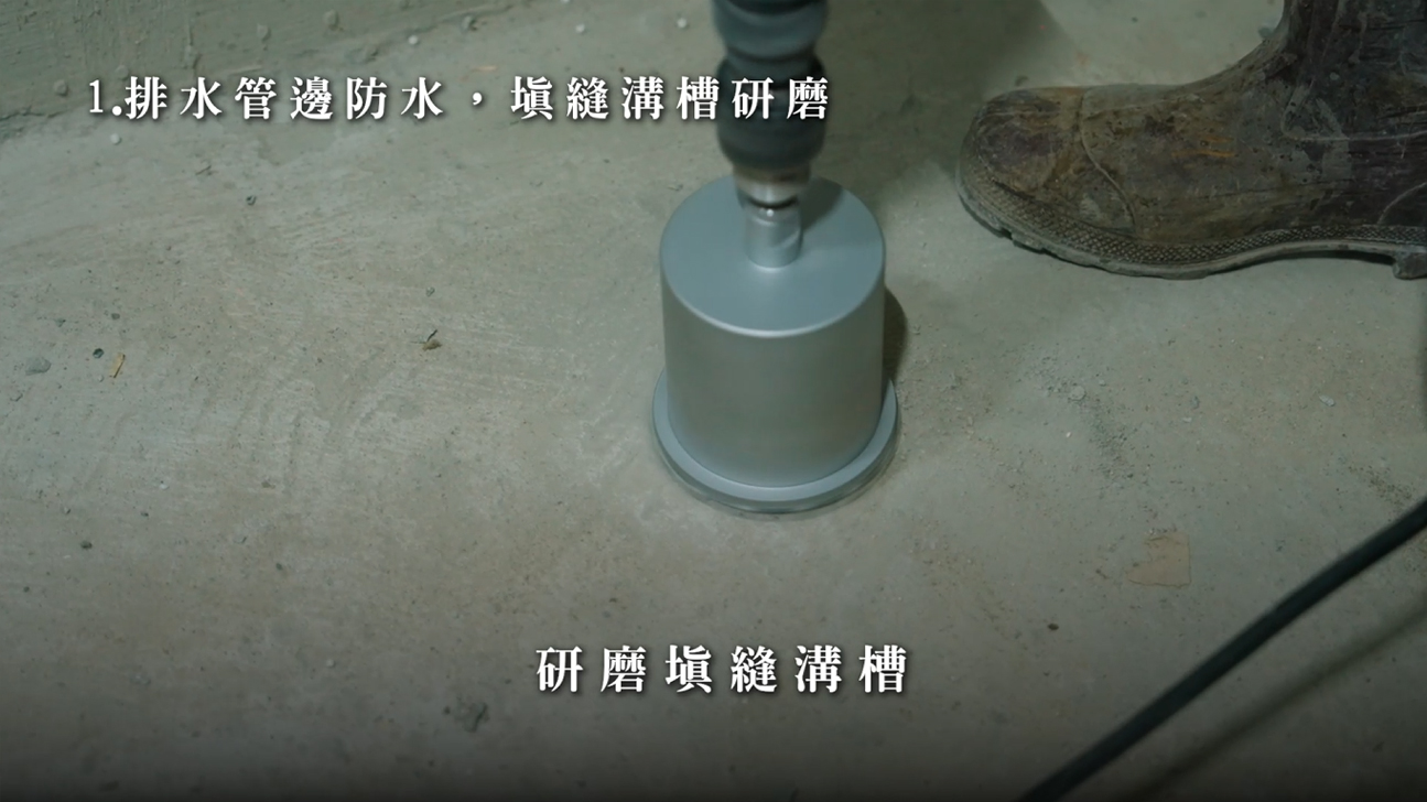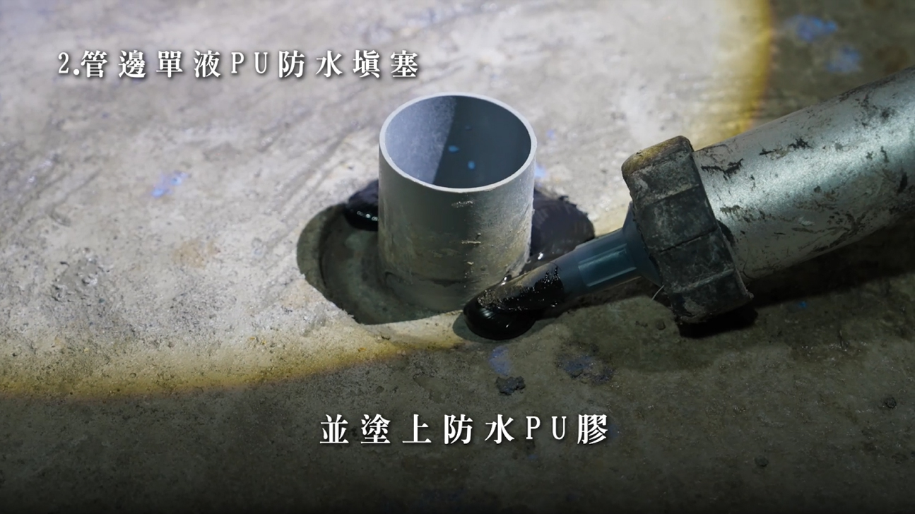 針對最易滲漏的排水管出口,先研磨填縫溝槽,再於管邊填塞單液PU補強,減少管材因磨損造成的漏水現象。